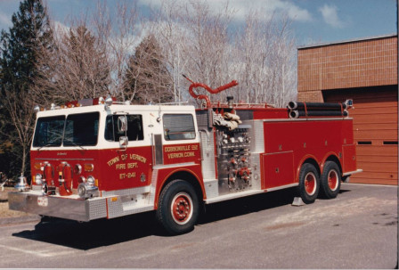 In order to solve that issue, Chief Maguda ordered a 1983 Hendrickson / Continental 2000 gallon pumper / tanker able to pump 1500 gallons per minute onto a fire. The paint scheme was returned to traditional red as the previous engine was painted white. This apparatus was built in Hopkinton, Massachusetts, and designated ET-241, as it is today. This innovative approach was able to alleviate the issue of large areas without hydrants, and Company 2 operates to this day the largest water capacity on any apparatus in the Town of Vernon.